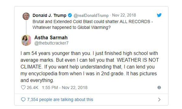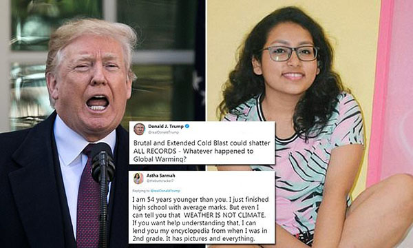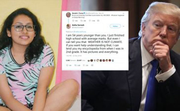 புவி வெப்பமயமாதலையும், பருவகாலத்தையும் புரிந்துகொள்ள முடியாத அமெரிக்க ஜனாதிபதி டொனால்ட் டிரம்ப்பின் மூக்கை அறுத்த இந்திய இளம்பெண்ணுக்கு பாராட்டுக்கள் குவிந்து வருகிறது.