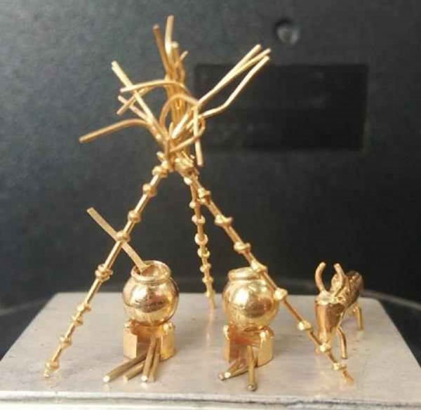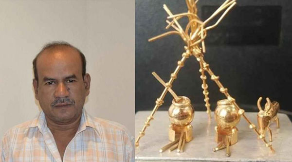 இந்த நிலையில், பொங்கல் பண்டிகையையொட்டி மூன்று கரும்பு, பானை, அடுப்பு, விறகு, காளை மாடு, கரண்டி ஆகியவற்றை தங்கத்தால் தத்ரூபமாக உருவாக்கி சாதனை படைத்துள்ளார்.