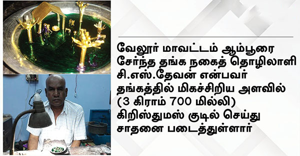 வேலூர் மாவட்டத்தை சேர்ந்த சி.எஸ்.தேவன் என்ற நகைத்தொழிலாளி தங்கத்தில் கரும்பு, பானை செய்து அசத்தியுள்ளார். கின்னஸ் சாதனைப் புரிவதற்காக மில்லி கிராம் தங்கத்தில் நுண்ணிய அளவில் பல்வேறு மாதிரி பொருட்களை திறம்பட உருவாக்கி வருகிறார்.
