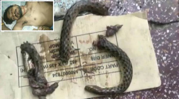 தன்னை கடித்த விஷப்பாம்பை கடித்து துண்டுகளாக்கிய இளைஞர்!!