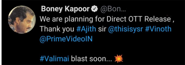 இந்நிலையில் தல அஜித்தின் வலிமை திரைப்படம் ஓடிடியில் வெளியாக போகிறது என தயாரிப்பாளர் போனி கபூர் அறிவித்துள்ளதாக பதிவு வெளியாகியுள்ளது.