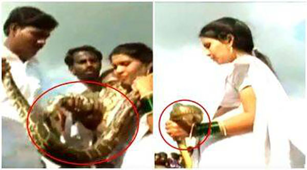 திருமணத்தில் மாலைக்கு பதில் மலைப்பாம்பை மாற்றிக்கொண்ட மணமக்கள்.. நடந்த ஆச்சரியத்தின் வீடியோ!!