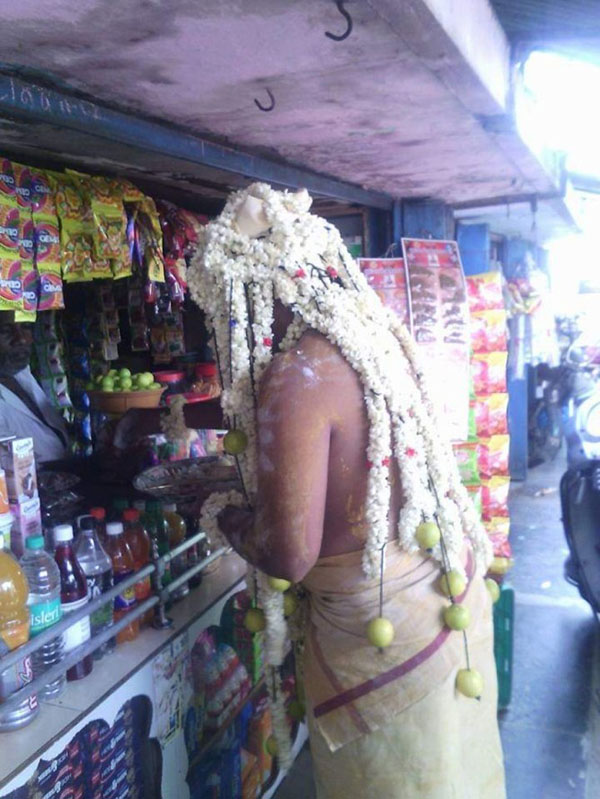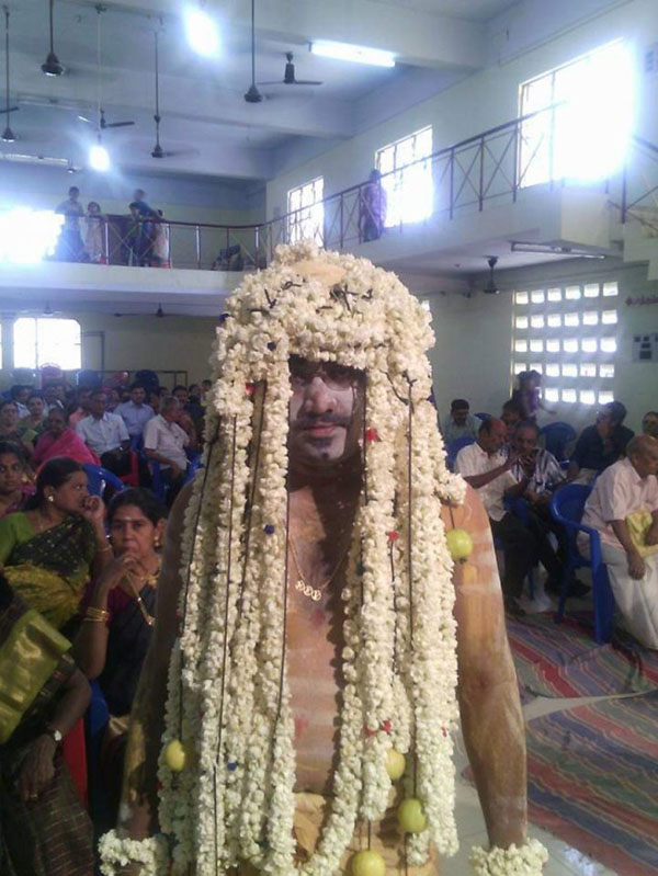 மதுரையில் வாழும் சௌராஸ்ட்ரா மக்களில் முசுவாதி என்ற வீட்டுப் பெயரைக் கொண்டவர்கள் தங்கள் வீட்டு ஆண்களுக்கு திருமணம் செய்யும் போது முதல் நாள் மணமகனை நன்கு அலங்கரித்து அதாவது முகத்தில் திருநீறு மற்றும் கண் மை பூசி தங்கள் குலசாமி யாக அழகு பார்ப்பார்கள்.