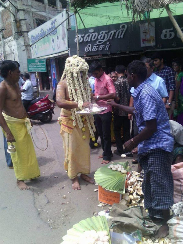 பின்பு பொங்கல் படையலிட்டு சாமி கும்பிட்ட பின்பு மணமகன் பட்டினபிரவேசம் என்ற நகர்வலம் வந்து பிச்சை எடுக்க வேண்டும். அப்போது உறவினர்கள் பாதாபிசேகம் செய்து வணங்குவர். மணமகனிடம் அனைவரும் வயது வித்தியாசம் இன்றி ஆசி பெறுவார்கள்.