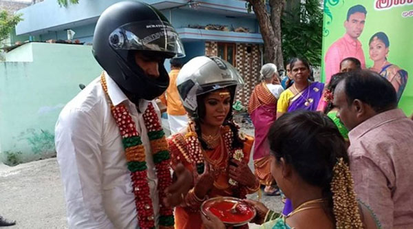 திருமணம் முடிந்த கையோடு மாலையும் கழுத்துமாக திருமண மண்டபத்தை விட்டு கிளம்பிய தம்பதி சீலநாயக்கன்பட்டி பகுதியில் உள்ள வீடுகளை நோக்கி சென்று தலைக்கவசம் அணிந்தபடி சென்று விழிப்புணர்வு ஏற்படுத்தினார்கள்.