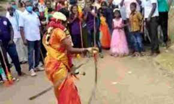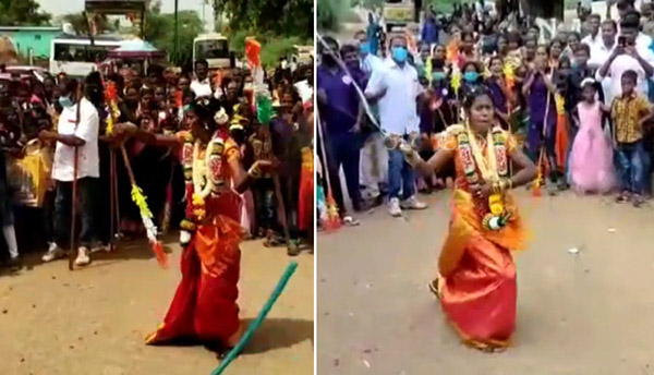 தமிழகத்தில் மணக்கோலத்தில் மணப்பெண் இரண்டு கைகளில் சிலம்பம் மற்றும் சுருள் வாள் வீசி அசத்திய வீடியோ வைரலாகியுள்ளது.