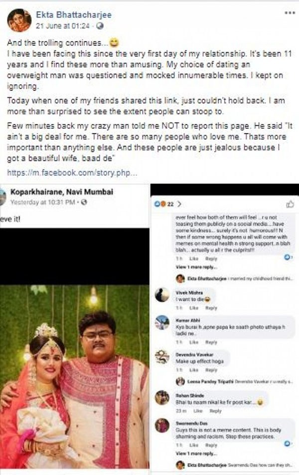 11 வருடங்கள் காதலித்து திருமணம் செய்து கொண்டவர்கள் புகைப்படம் இப்படி கிண்டல் செய்யப்படும் மீம்ஸ்கள் எக்தா கவனத்துக்கு செல்ல அவர் மிகவும் கோபமடைந்து குறிப்பிட்ட அந்த மீம்ஸ் பேஜ் மீது புகாரளிக்க முடிவு செய்துள்ளார்.