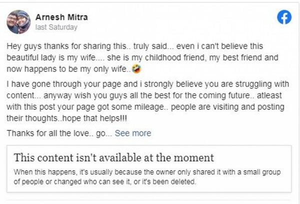 ஆனால், அர்னேஷ் மித்ராவோ புகார் எதுவும் அளிக்க வேண்டாம். எனக்கு கிடைத்ததை போல அழகான மனைவி அவர்களுக்கு கிடைக்கவில்லை என்ற விரக்தியில் தான் இது போன்ற நடவடிக்கைகளில் ஈடுபடுகின்றனர். அவர்கள் என்ன வேண்டுமானாலும் செய்து விட்டு போகட்டும் என கூறியுள்ளார்.