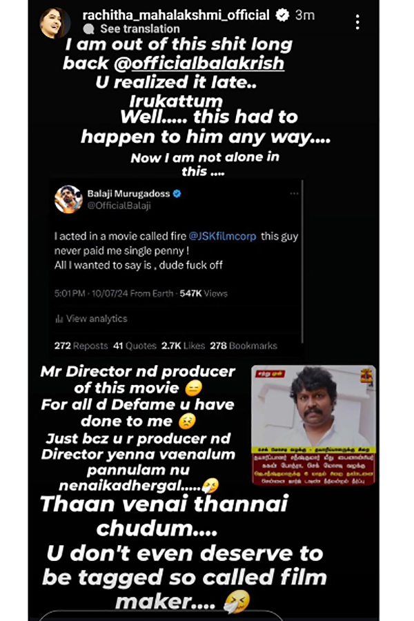 மேலும், நீங்கள் ஒரு படத்தின் தயாரிப்பாளர், இயக்குனராக இருக்கலாம், அதற்காக என்ன வேண்டுமானாலும் பண்ணலாம் என்று நினைக்க வேண்டாம், தன்வினை தன்னைச்சுடும், தயாரிப்பாளர், இயக்குனர் என்று நீங்கள் சொல்வதற்கே தகுதியற்றவர் என்று ஜே எஸ் கே சதீஷை டேக் செய்து திட்டியுள்ளார். இதற்கு தயாரிப்பாளர் சதீஷ், ரச்சிதா மகாலட்சுமிக்கு பதிலடி கொடுக்கும் வண்ணம் ஒரு பதிவினை பகிர்ந்துள்ளார்.