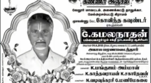 இதனை பார்த்த சக கலைஞர்கள் அவரை தூக்கி அருகில் இருந்த ஒடுகத்தூர் அரசு ஆரம்ப சுகாதார நிலையத்திற்கு கொண்டு சென்றனர். அங்கு கமலநாதனை பரிசோதித்த மருத்துவர்கள் மாரடைப்பால் கமலநாதன் முன்கூட்டியே உயிரிழந்துவிட்டதாக தெரிவித்தனர்.