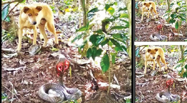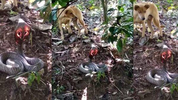 இதனால் அப்பகுதிக்கு சென்று அவினாஷ் பார்த்துபோது, நாகபாம்பு ஒன்று நாய் முன் படம் எடுத்தபடி நின்றது. மேலும் பாம்பின் பின்புறத்தில் நெருப்புபோல் சிவப்பு வர்ணம் தெரிந்தது. இதனால் அதிர்ச்சி அடைந்த அவினாஷ் தனது செல்போனில் வீடியோ எடுத்துள்ளார்.