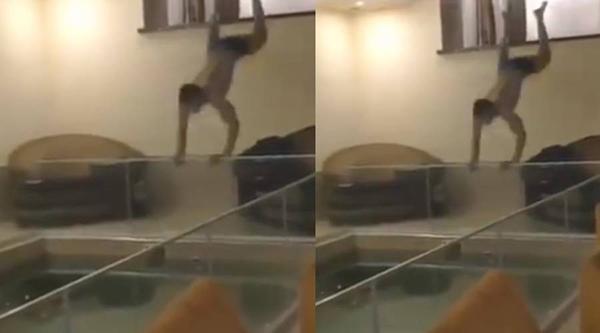 அந்த நபர் மேல் தளத்தில் இருந்து ஓடி வந்து டைவ் அ டி த் து நீச்சல் குளத்தில் பாய நினைத்தார். ஆனால், நடுவே நீ ச் ச ல் குளத்தை சு ற் றி க ண் ணாடி சு வ ர் எழுப்பப்பட்டுள்ளதை ம ற ந் து விட்டாரோ என்னவோ. ஓடி வந்து டைவ் அ டி த் தவர் நேராக கண்ணாடியில் போ ய் மோ தி னார் .