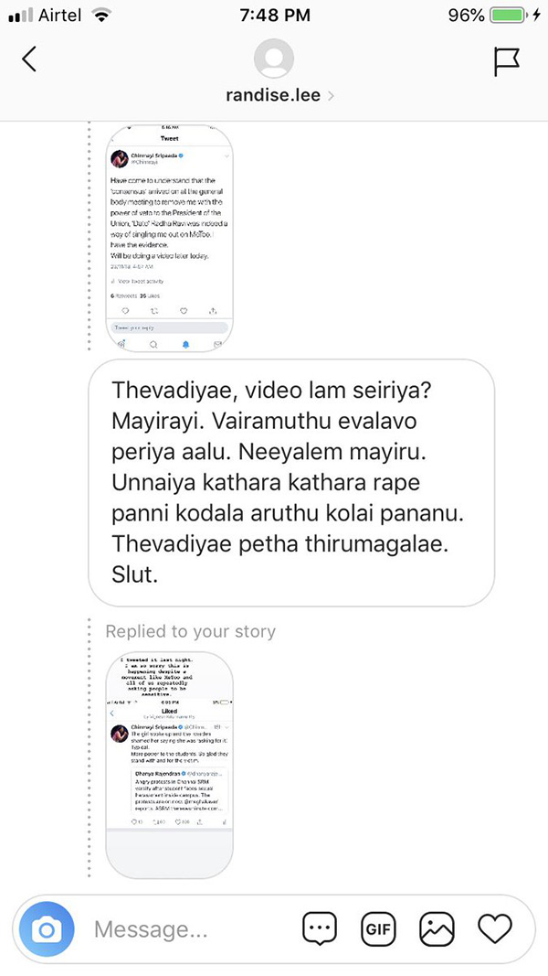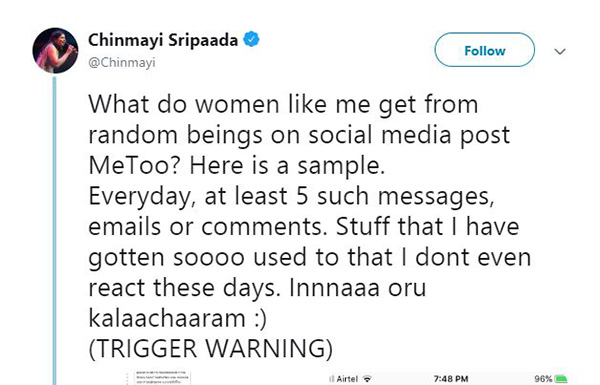 தொடர்ந்து, மெசேஜ் மூலம் அவரை பலர் ஆபாசமாக திட்டியிருக்கிறார்கள். அதை சின்மயியும் தனது டுவிட்டரில் வெளியிட்டு இருக்கிறார்.