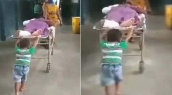 உ த்திர பி ரதேசத்தில் 6 வயது சிறுவன் ஒருவர் தனது தா யுடன் சேர்ந்து ஸ் ட்ரெச்சரை தள்ளிச் செல்லும் கா ட்சி அ திர்ச் சியை ஏ ற்படுத்தியுள்ளது.