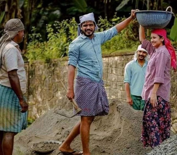திருமண தம்பதிகள் கட்டிடம் கட்டும் கட்டுமான பணியில் ஈடுபடும் ஊழியர்களை போன்று காட்சி தருகின்றனர்.