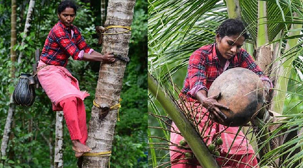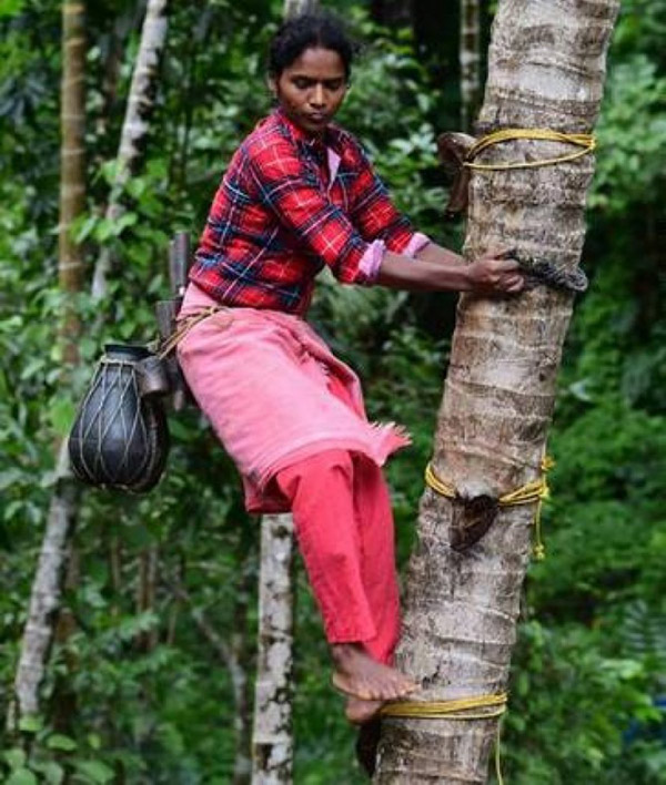 இந்தியாவின் கேரள மாநிலத்தில் குடும்ப வறுமை காரணமாக, பெண் ஒருவர் கள் இறக்கும் தொழிலில் ஈடுபட்டுள்ளார்.