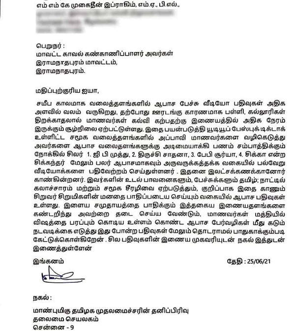 மேலும், இராமநாதபுரம் மாவட்ட காவல் கண்காணிப்பாளருக்கு எம்.எம்.கே.முகைதீன் என்பவர் அனுப்பி உள்ள புகாரில், சமீபகாலமாக வலைதளங்களில் ஆ.பா.ச வீ.டியோ பதிவுகள் அதிக அளவில் வலம் வருகிறது.