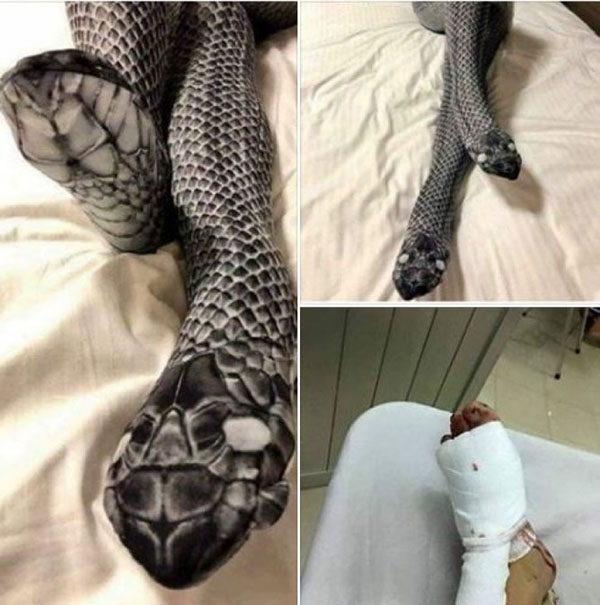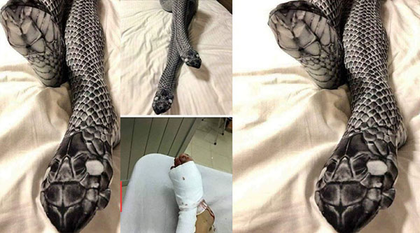 பாம்பு போன்று உடை அணிந்திருந்த மனைவியின் கால்களை பதம் பார்த்த கணவன் : நடந்த வினோத சம்பவம்!!