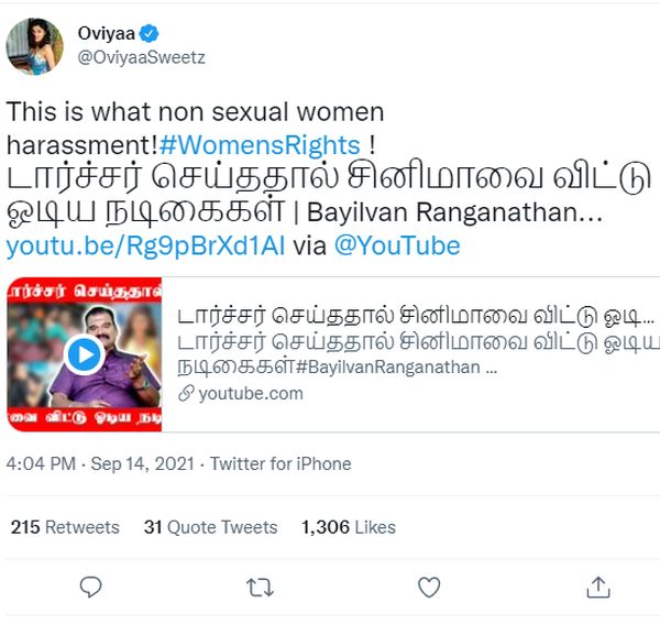 அதை செய்தது மட்டுமின்றி அதில் அவர் ‘womanrights’ என்ற ஹேஷ்டேக்கையும் உபயோகப்படுத்தி உள்ளார். தூங்கிக் கொண்டிருந்த சிங்கத்தை தட்டியெழுப்பியது போல் ஓவியா ட்விட் பக்கத்தில் பகிர்ந்து இருந்த நடிகர் பயில்வான் ரங்கநாதனின் வீடியோவை கண்டதும் ஓவியா ஆர்மி பொங்கி எழுந்தது.