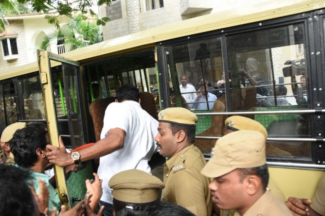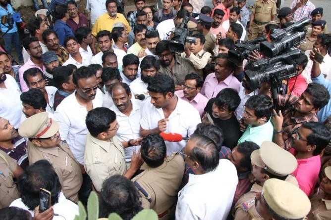 சட்டவிரோதமாக கூடியதாக கைது செய்ய நேரிடும் என்று பொலிசார் எச்சரித்தனர். இருப்பினும் விஷால் தொடர்ந்து பூட்டை உடைக்க முயன்றதால், அவர் மற்றும் ஆதரவாளர்கள் கைது செய்யப்பட்டனர்.