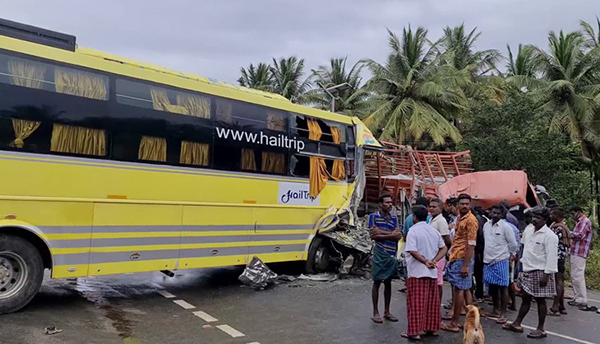 பேருந்தும், லாரியும் மோதி கோர விபத்து.. இரு வாகன ஓட்டுநர்களும் சம்பவ இடத்திலேயே பலி!!