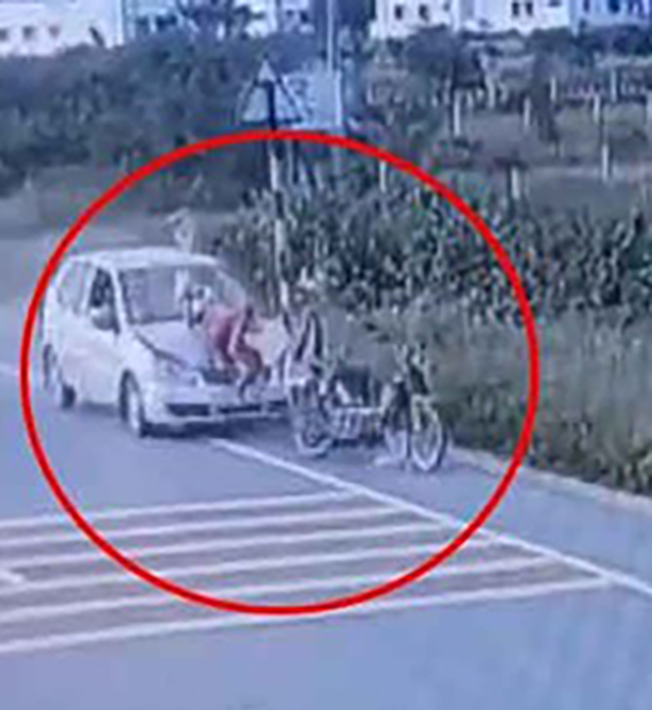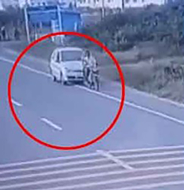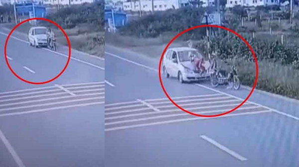 வேகமாக வந்து கொண்டிருந்த கார் திடீரென நிலைதடுமாறி முன்னால் சென்றுகொண்டிருந்த பைக் மீது மோதி விபத்துக்குள்ளானது.
