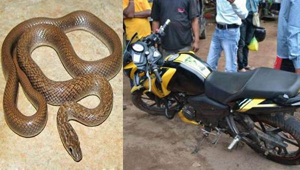 அங்கிருந்து மீண்டும் புறப்படுவதற்காகப் பைக்கை எடுத்தபோது பெட்ரோல் டேங்கின் அடியில் இருந்து பாம்பு தலைகாட்டியுள்ளது. இதனைப்பார்த்த அவர் அலறி கூச்சல் எழுப்பியதால் அக்கம் பக்கத்தில் நின்றவர்கள் உதவிக்கு ஓடிவந்துள்ளனர்.