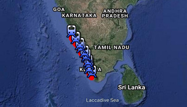 கர்நாடக மாநிலத்தின் எல்லையை ஒட்டியுள்ள காசர்கோடு நகரத்திலிருந்து திருவனந்தபுரம் வரை சுமார் 531 கிலோ மீட்டர் தொலைவு உள்ளது. சாதாரணமாக. இந்த தொலைவை கடக்க 12 மணி நேரமாகும்.