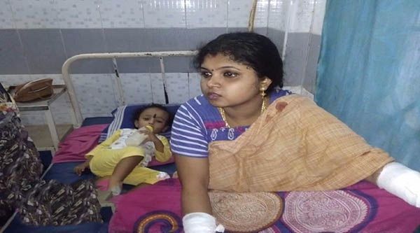 அப்போது கிஷோர், மாமியார், மாமனார், நாத்தனார் ஆகியோர் நந்தினியிடம் பணம் கேட்டுள்ளனர். தற்போது பணம் இல்லை என நந்தினி கூற, ஆத்திரமடைந்த கிசோர் அரிவாளால் நந்தினியை வெட்டியுள்ளார். இதனையடுத்து உடனடியாக நந்தினி மற்றும் அவருடைய குழந்தையின் மீது மண்ணெண்னையை ஊற்றிய மாமியாரும், நாத்தனாரும் இருவரையும் எரித்து கொலை செய்ய முயற்சித்துள்ளார்.
