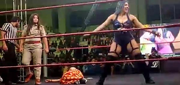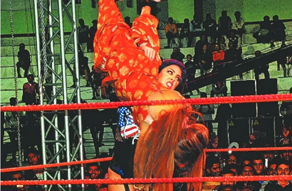 அப்போது நடைபெற்ற போட்டியில், மல்யுத்த வீராங்கனை ரோபெல் தன்னை எதிர்த்து களமிறங்கிய வீராங்கனையை வீழ்த்தினார். பின்னர், தன்னுடன் மோத பெண்கள் யாராவது தயாராக இருக்கிறீர்களா என்று பார்வையாளர்களை நோக்கி சவால் விடுத்துள்ளார்.
