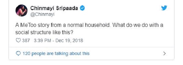 இதனை சின்மயி தனது டுவிட்டர் பக்கத்தில் பதிவிட்டுள்ளார். இது போன்ற சமூக அமைப்பில் நாம் என்ன செய்கிறோம் என கேள்வி எழுப்பியுள்ளார்.