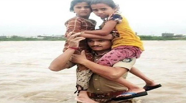 மார்பளவு வெள்ளம் : ஒன்றரை கி.மீ குழந்தைகளை தோளில் சுமந்த காவலர் : குவியும் பாராட்டுக்கள்!!