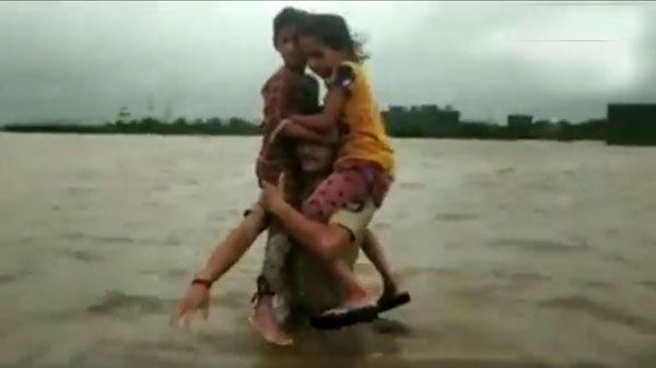 இந்திய மாநிலம் குஜராத்தில் மார்பளவு வெள்ளத்தில், இரண்டு குழந்தைகளை தோளில் சுமந்தபடி பத்திரமாக தூக்கிச் செல்லும் காவலரின் வீடியோ ஒன்று சமூக வலைத்தளங்களில் வேகமாக பரவி வருகிறது.
