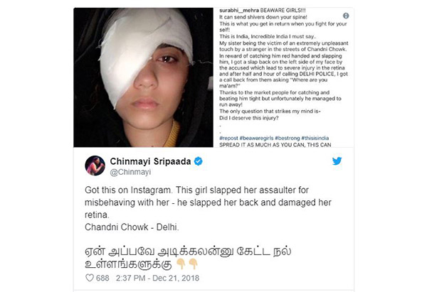 அதாவது டெல்லியை சேர்த்த ஒரு இளம் பெண் தன்னிடம், தவறாக நடந்து கொண்ட ஒருவரை தாக்கியுள்ளார். இதனால் அந்த ஆண், இந்த பெண்ணை திருப்பி அடித்த போது, அந்தப் பெண்ணின் கண் கருவிழிகள் பாதிப்படைந்துள்ளது. இதனை பதிவிட்டு சின்மயி, அதனுடன் ஏன் அப்பவே அடிக்கலன்னு கேட்ட நல் உள்ளங்களுக்கு என குறிப்பிட்டுள்ளார்.