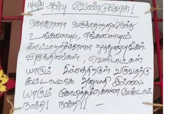 உறவினர்கள் உட்பட யாரும் வீட்டுக்கு வர வேண்டாம்’ என தன்னுடைய வீட்டின் முன் அறிவிப்பு பலகை வைத்துள்ள ஆசிரியரின் செயல் சமூவலைத்தளங்களில் வைரலாகி வருகிறது.