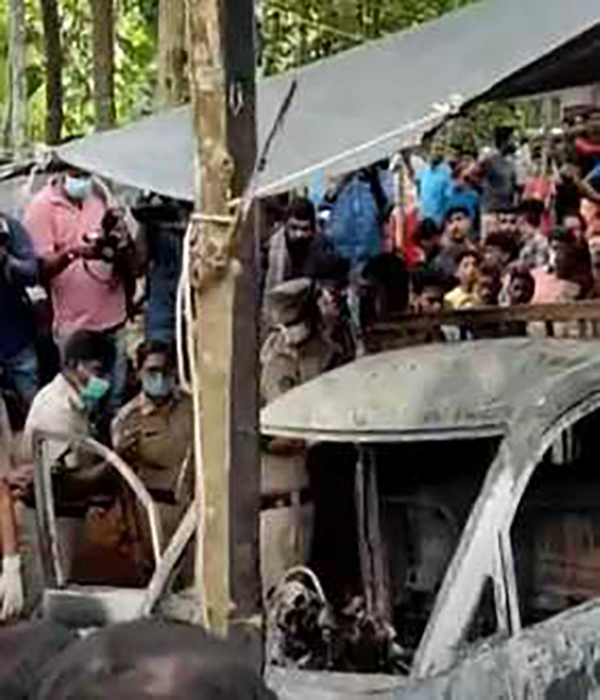 இந்நிலையில் அங்கு வந்தவர்கள் வாகனத்தின் கதவை உடைத்து ஒரு மகளை காயத்துடன் மீட்டனர். எஞ்சிய இருவரும் வாகனத்திலேயே தீக்கிரையாகி பலியாயினர்.