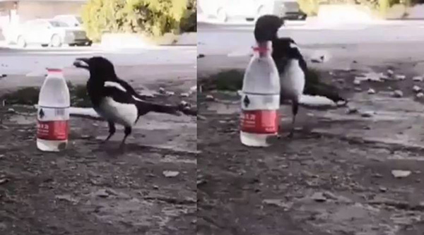 வாட்டர் பாட்டிலில் கல் போட்டு தண்ணீரை குடிக்கும் பறவை; பார்வையாளர்களை வியக்க வைத்த வைரல் வீடியோ!!