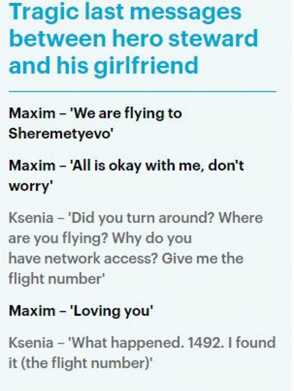 இந்த விபத்திற்கான காரணம் குறித்து அதிகாரிகள் தீவிர விசாரணை மேற்கொண்டு வருகின்றனர். இந்த நிலையில் விபத்திற்கு முன்னர் மாக்சிம் மோஸியேவ் தன்னுடைய காதலி க்ஸ்சியா ஒபிர்ட்ஸ்வாவாவிற்கு நம்பிக்கை கொடுக்கும் விதமாக மெசேஜ் செய்துள்ளார்.