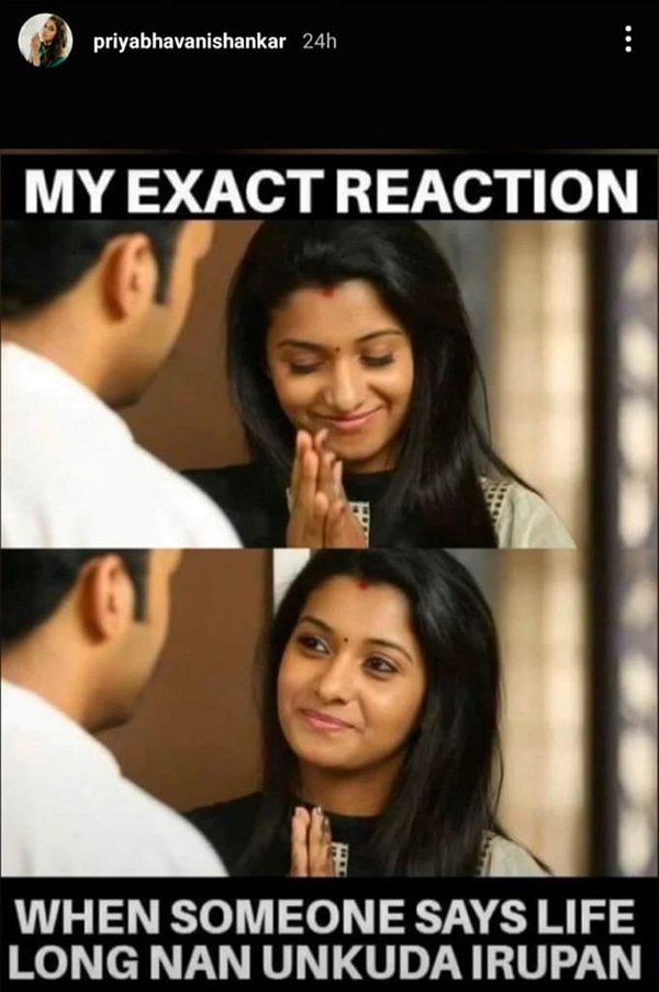 பலருக்குமே இந்த செய்திகள் குறித்து எந்த ஒரு விஷயமும் சி க்காமல் இருந்து வந்த வேளையில் அவரே ஒரு இந்த பதிவு போட்டதுமே இணையத்தில் பிரியா பவானி சங்கர் தன்னுடைய காதலரைப் பி ரிந்து விட்டார் எனவும் இளம் நடிகர் ஒருவரை காதலித்து வருகிறார் எனவும் ஒரு புதிய செய்தியை கி ளப்பி வி ட தொடங்கி விட்டனர். இப்போது இதை சரிகட்ட அவர் இன்னொரு மீம் போட வேண்டியதாகி விட்டது.