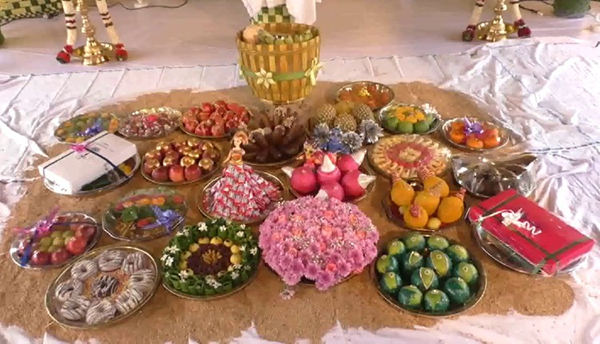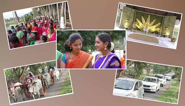 விழா நடைபெற்ற விவசாய தோட்டத்தில் தென்னை ஓலையில் வேய்ந்த குடிசையில் பாரம்பரிய ரக நெல் மணிகளைக் கொட்டி அதில் வைத்த சீர் வரிசைத் தட்டுகளும் ஊரார் கண்படும் அளவுக்கு இருந்தன. அதேபோல் பித்தளை பாத்திரங்களில் பாரம்பரிய உணவு வகைகள் சமைத்துப் பரிமாறப்பட்டன. தாய்மாமன் சீராகக் கொண்டுவந்த காங்கேயம் காளைகள், வெள்ளாடுகள் போன்றவை பலரையும் வெகுவாகக் கவர்ந்தன.