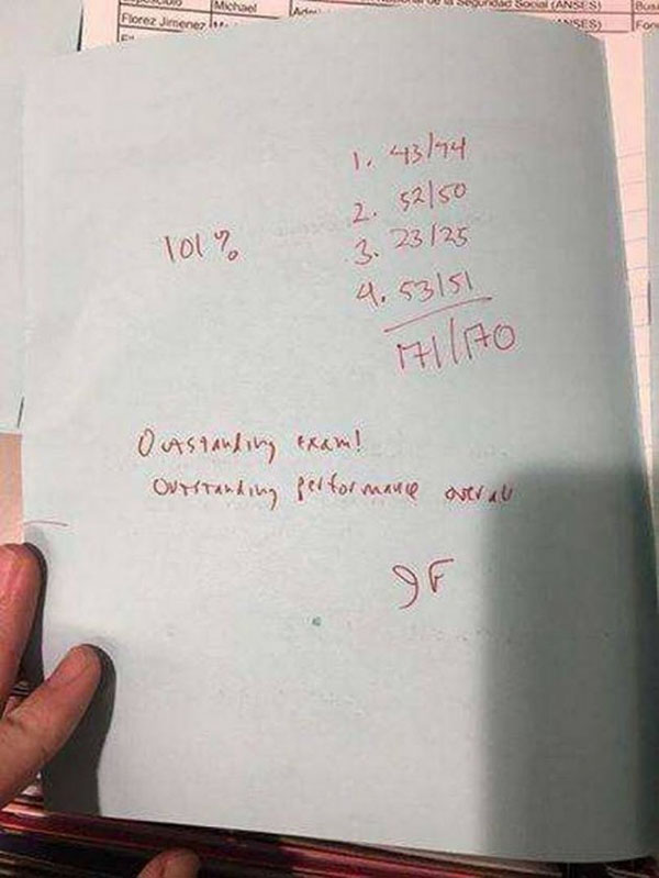இது உங்களுக்காகத்தான் அப்பா என்று குறிப்பிட்டுள்ளார். ஆனால் எப்படி 170-க்கு 171 மதிப்பெண் எடுத்தேன் என்பதை அவர் தெளிவாக குறிப்பிடவில்லை. ஜெப்ரி ப்ராங்கல், ஹார்வர்டில் பணியாற்றும் சர்வதேச முன்னணிப் பொருளாதார பேராசிரியர் ஆவார் என்பது குறிப்பிடத்தக்கது.