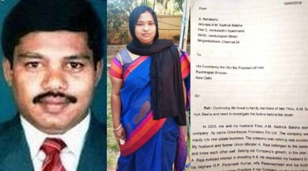 சென்னை தி.நகரில் கிரீன் ஹவுஸ் புரமோட்டர்ஸ் என்ற பெயரில் ரியல் எஸ்டேட் நிறுவனம் நடத்தி வந்தவர் சாதிக்பாட்சா. இவருக்கு ரேஹா பானு என்ற மனைவியும் 2 குழந்தைகளும் உள்ளனர். 2ஜி வழக்கு உச்சத்தில் இருந்த நேரத்தில் சாதிக்பாட்சா வீட்டிலும் 2010-ம் ஆண்டு சிபிஐ சோதனை செய்தது. சோதனை நடந்த சில மாதங்களில் சாதிக்பாட்சா திடீரென தற்கொலை செய்துகொண்டார் என்று தகவல் வெளியானது.