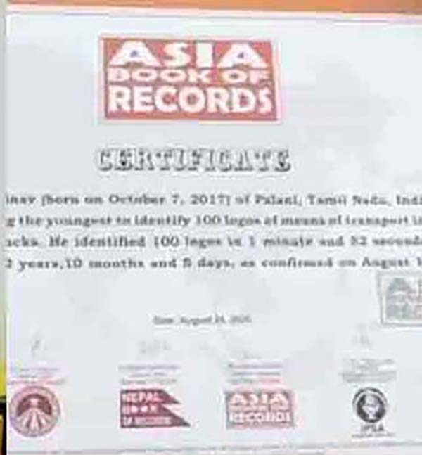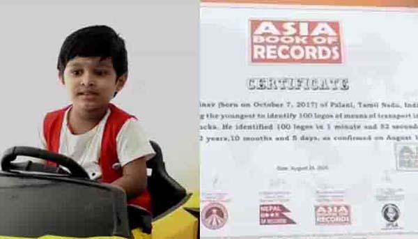 சிறுவனின் இந்த சாதனையை பாராட்டி இந்தியன் புக் ஆஃப் ரெக்கார்டு மற்றும் ஆசியா புக் ஆஃப் ரெக்கார்டு ஆகிய சாதனை புத்தகங்களில் இடம்பிடித்துள்ளது ஆச்சரியத்தை ஏற்படுத்தியுள்ளது.