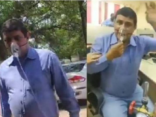 ஜார்க்கண்ட் மாநிலதில் வங்கி அதிகாரி ஒருவர் ஆக்சிஜன் மாஸ்க்குடன் வேலைக்கு வந்து அதிர்ச்சியை ஏற்படுத்தியுள்ளார்.