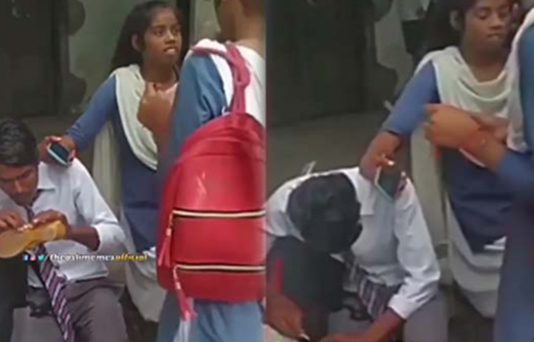 பெண் ஒருவரை கவர்வதற்கு இளைஞர் ஒருவர் அவரது ஷுவை கையில் எடுத்து பசை வைத்து ஒட்டும் காட்சி இணையத்தில் வைரலாகி வருகின்றது.