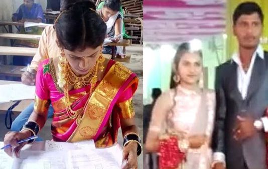 இந்தியாவின் கர்நாடக மாநிலத்தில் திருமணம் முடிந்த கையோடு தேர்வு எழுதிய புதுமணப்பெண்ணுக்கு பாராட்டுக்கள் குவிந்து வருகின்றன.