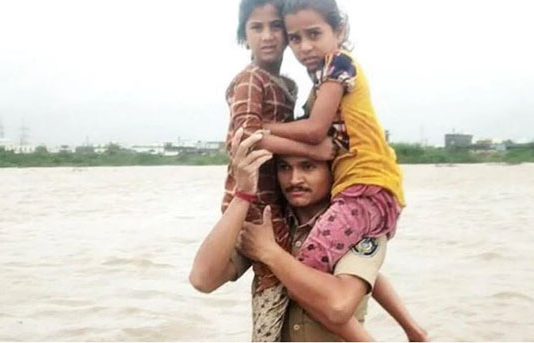 இந்திய மாநிலம் குஜராத்தில் மார்பளவு வெள்ளத்தில், இரண்டு குழந்தைகளை தோளில் சுமந்தபடி பத்திரமாக தூக்கிச் செல்லும் காவலரின் வீடியோ ஒன்று சமூக வலைத்தளங்களில் வேகமாக பரவி வருகிறது.