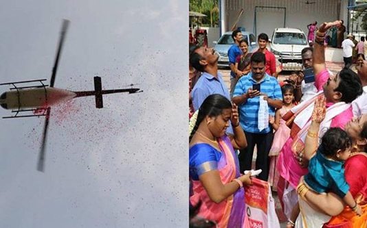 மகனின் முதல் பிறந்தநாளுக்கு ஹெலிகாப்டரில் இருந்து மலர் தூவிய தொழிலதிபர் : இன்ப அதிர்ச்சியடைந்த உறவினர்கள்!!