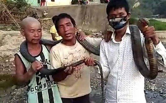 கொரோனா ஊரடங்கால் உணவு கிடைக்கவில்லை : ராஜ நாகத்தை கொன்று வாழை இலையில் விருந்து தயார் செய்த இளைஞர்கள்!!