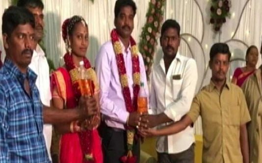 மணமேடையில் மணமக்களுக்கு பாட்டிலில் தரப்பட்ட பரிசுபொருளால் வியப்பு : என்ன தெரியுமா?